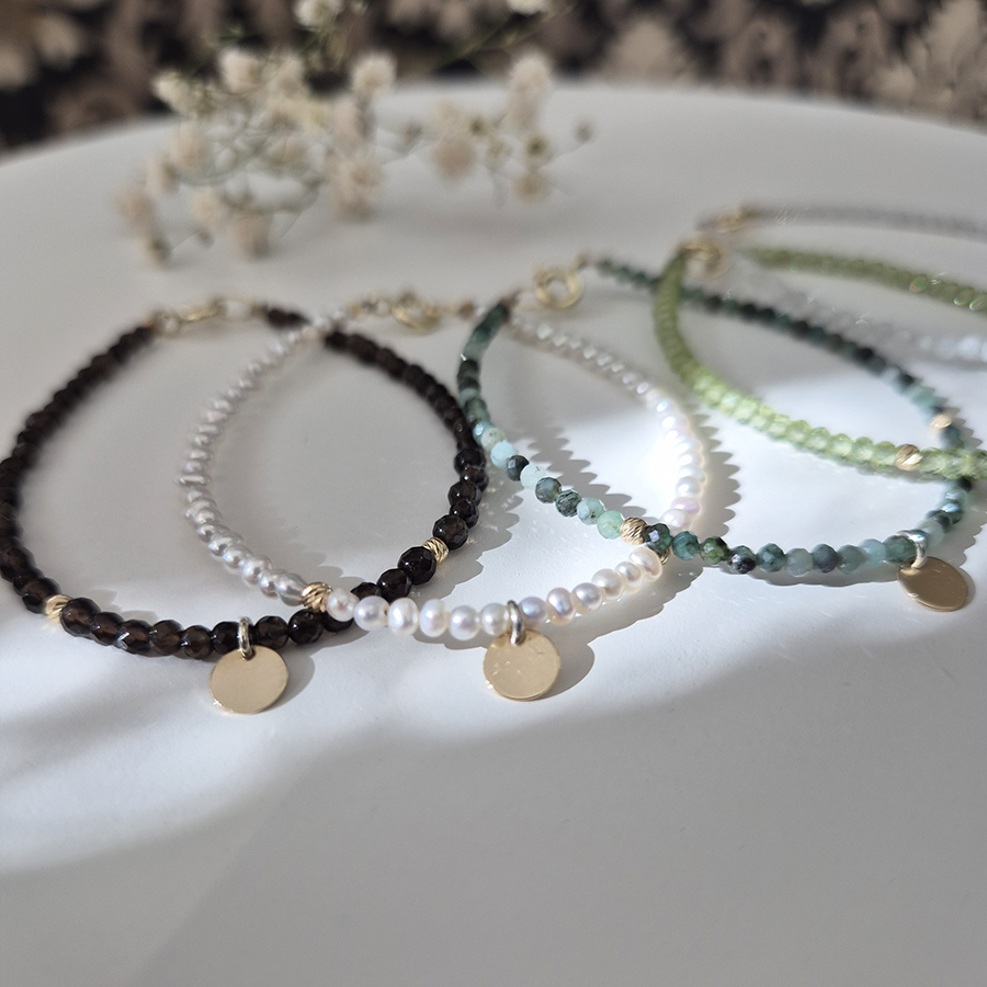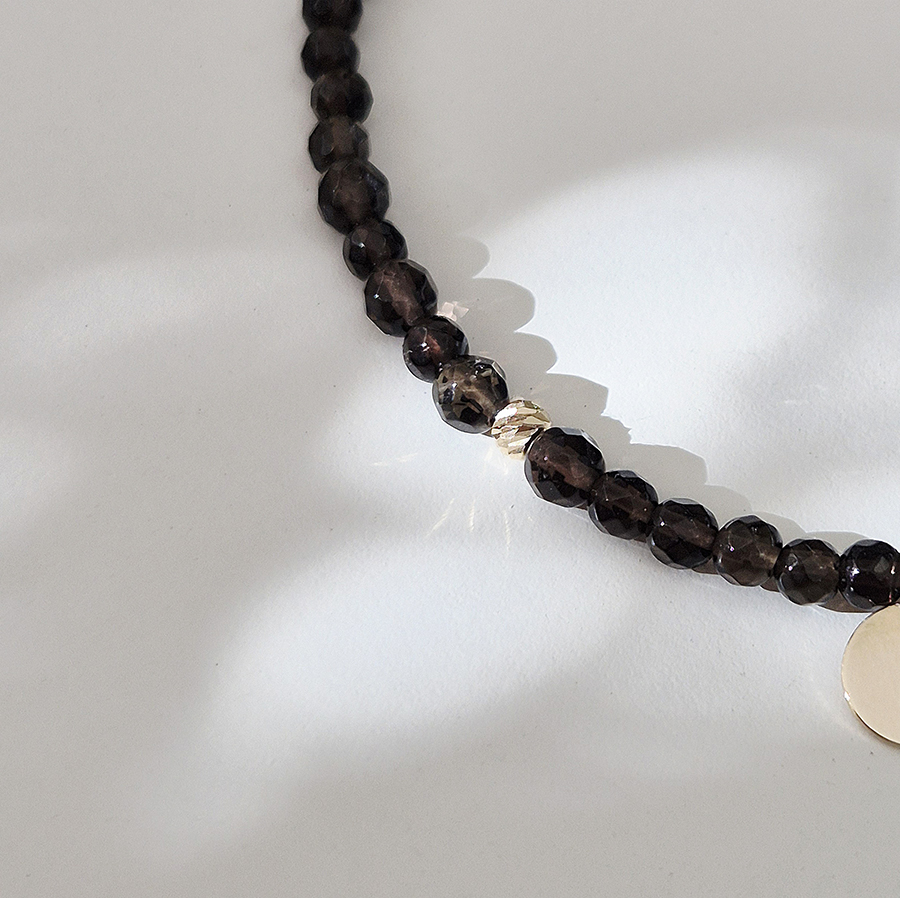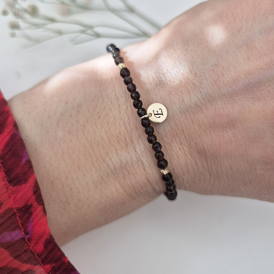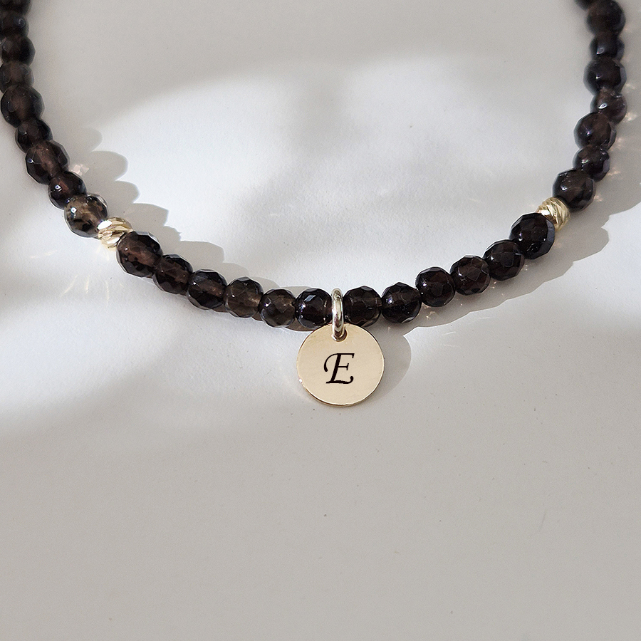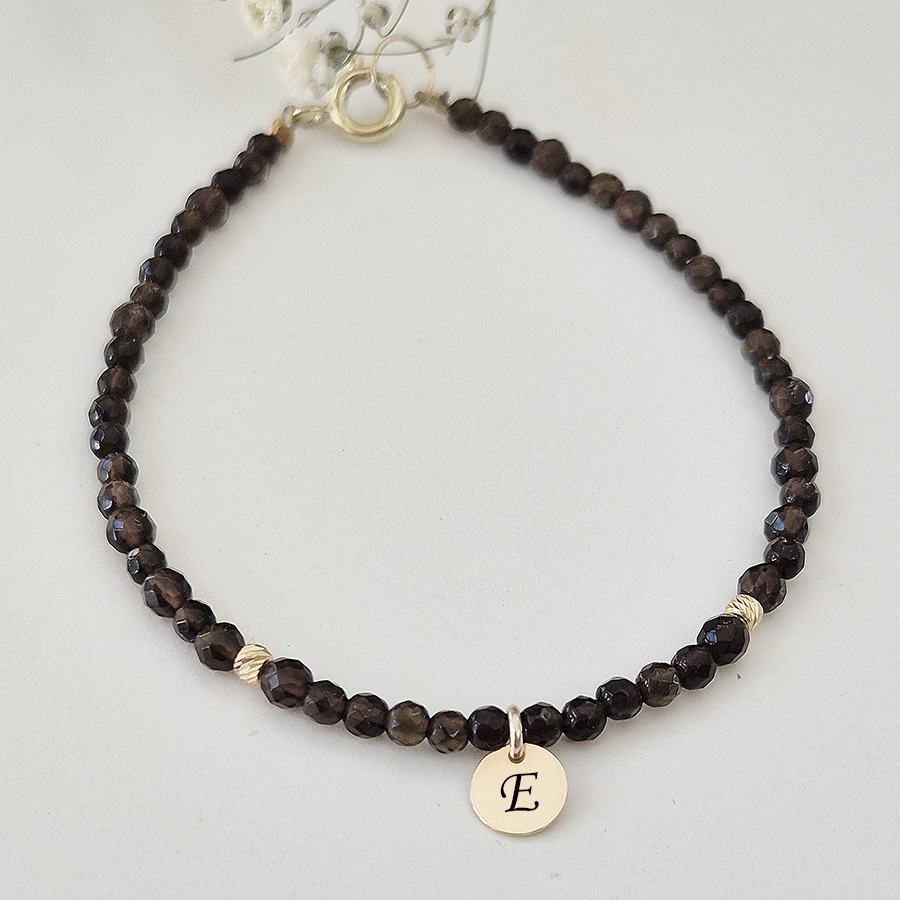 Tento zlatý náramok zo záhnedy so zlatými guličkami očarí hlbokým dymovo-hnedým odtieňom, ktorý v kombinácii so zlatom pôsobí luxusne a nadčasovo. Záhneda je polodrahokam symbolizujúci ochranu, uzemnenie a vnútornú stabilitu, pomáha uvoľňovať napätie a prináša pocit istoty. Jemný dizajn dopĺňa mini zlatý disk s možnosťou gravírovania iniciály, vďaka čomu sa náramok stáva osobným a výnimočným šperkom ideálnym na každodenné nosenie aj ako darček.