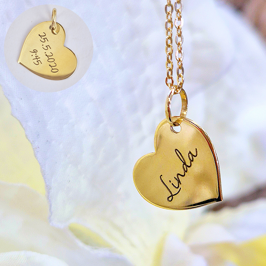 Úvod » Personalizované šperky → » Obojstranné zlaté SRDIEČKO s ÚDAJMI O NARODENÍ DIEŤATKA -14k zlato gravírované