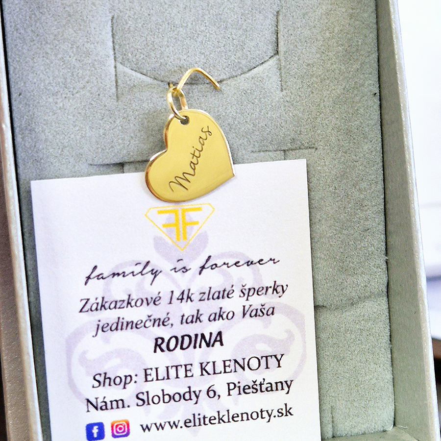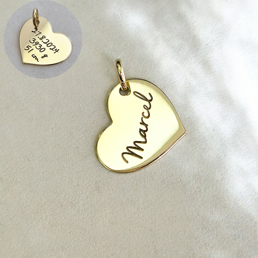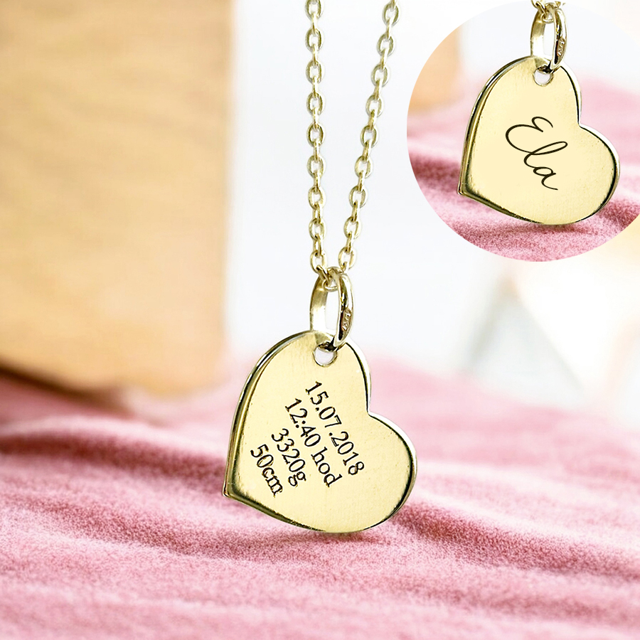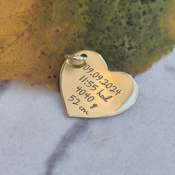 Elegantný zlatý prívesok v tvare srdca s možnosťou gravírovania mena dieťaťa a údajov o narodení – dátum, čas a váha. Vyrobený z kvalitného 14K zlata, ideálny ako darček k narodeniu bábätka, krstu alebo pre mamu, ženu či manželku. Jedinečná spomienka na celý život.