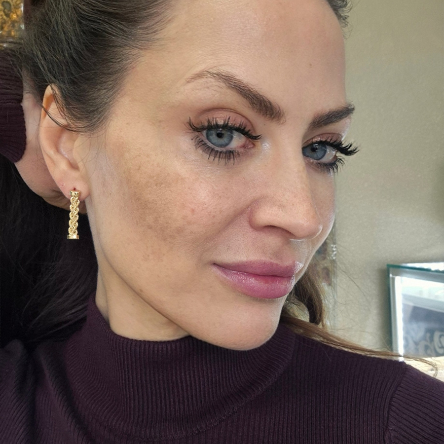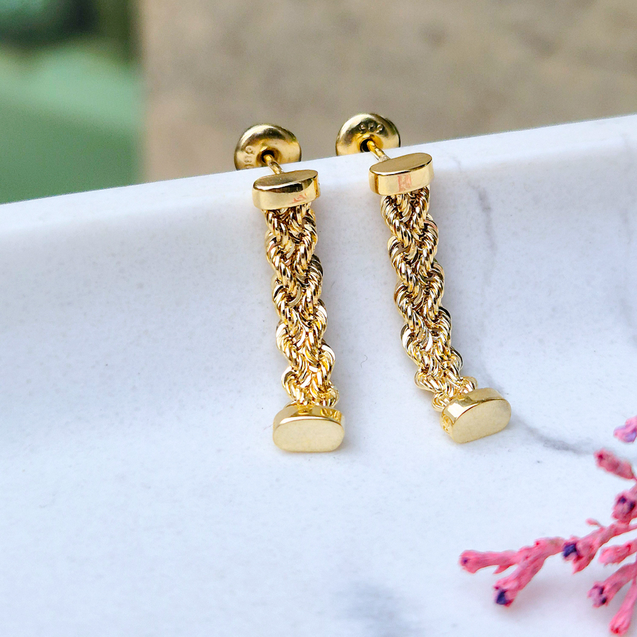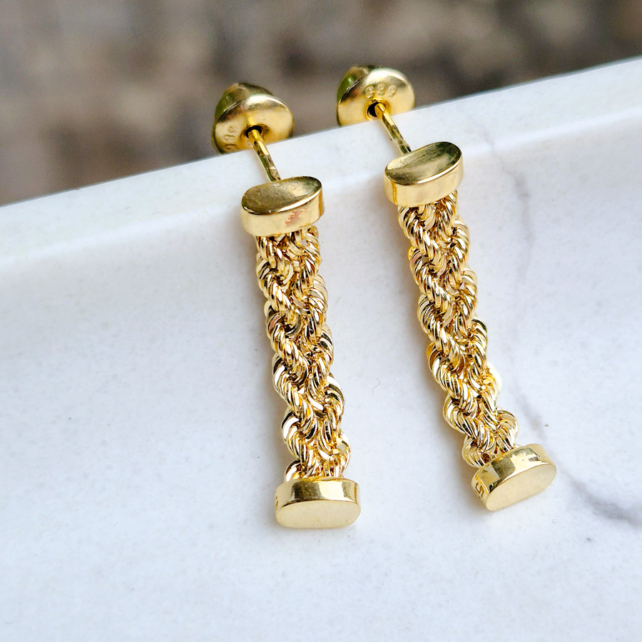 Tieto netradičné dlhé náušnice z pleteného zlata sú výnimočné. Zapletená časť je ohraničená hore aj dole lesklým valčekom. A práve tento kontrast robí náušnice zaujímavými a netradičnými a elegantne pôsobia v krátkych, či dlhých vlasoch.