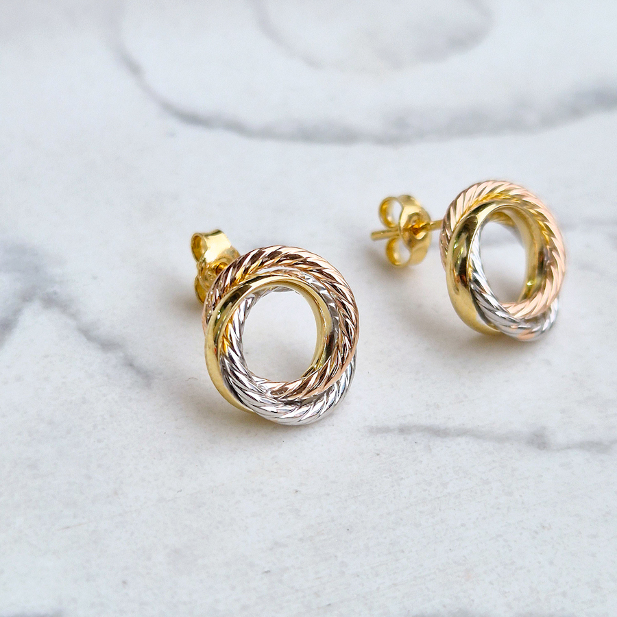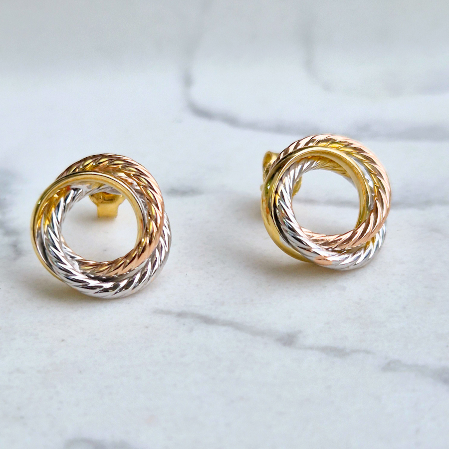 Úvod » Zlaté 14k šperky → » Zlaté napichovacie prepletené trojtónové KRÚŽKY
