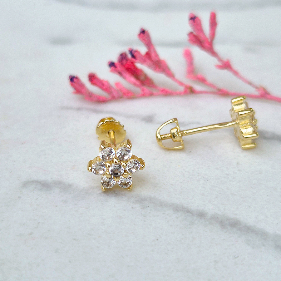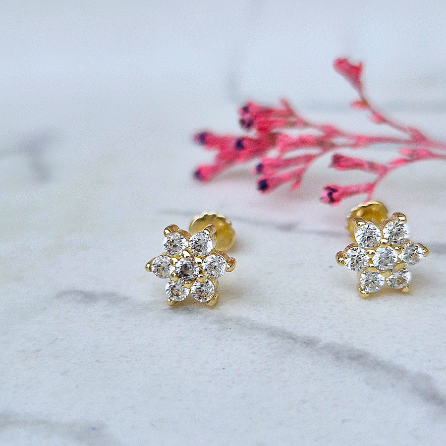 Tieto nádherné zlaté náušnice majú jemný kvetinový tvar vytvorený zo žiarivých zirkónov, ktoré spolu tvoria luxusný a harmonický dizajn. Ich elegantný, trblietavý štýl pôsobí žensky a nadčasovo, takže sa hodia na každý deň aj na slávnostné príležitosti. Sú ideálny darček, krásne prekvapenie a možno i dokonalý darček pod vianočný stromček.