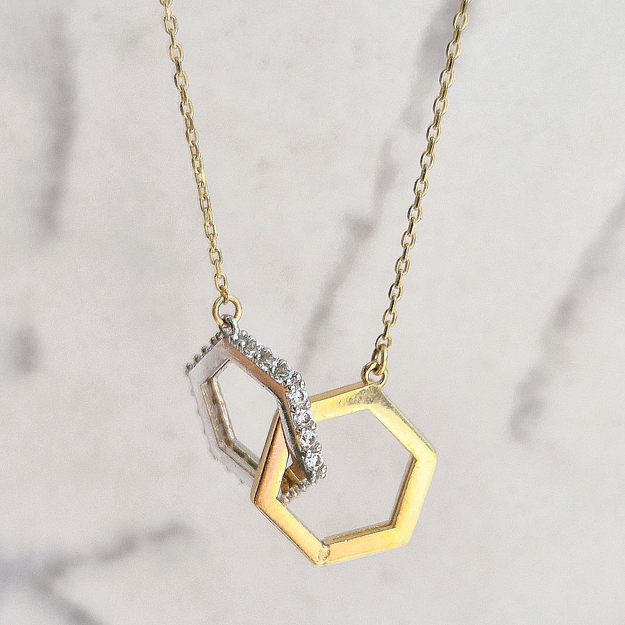 Jemný zlatý náhrdelník vás zaujme svojim dizajnom. V centrálnej časti sú do retiazky, zo žltého zlata, zakomponované dve kolieska. Sú po okraji vykladané zirkónmi. Jedno je zo žltého a druhé z bieleho zlata. Sú mierne hranaté v šesťuholníkovom tvare.