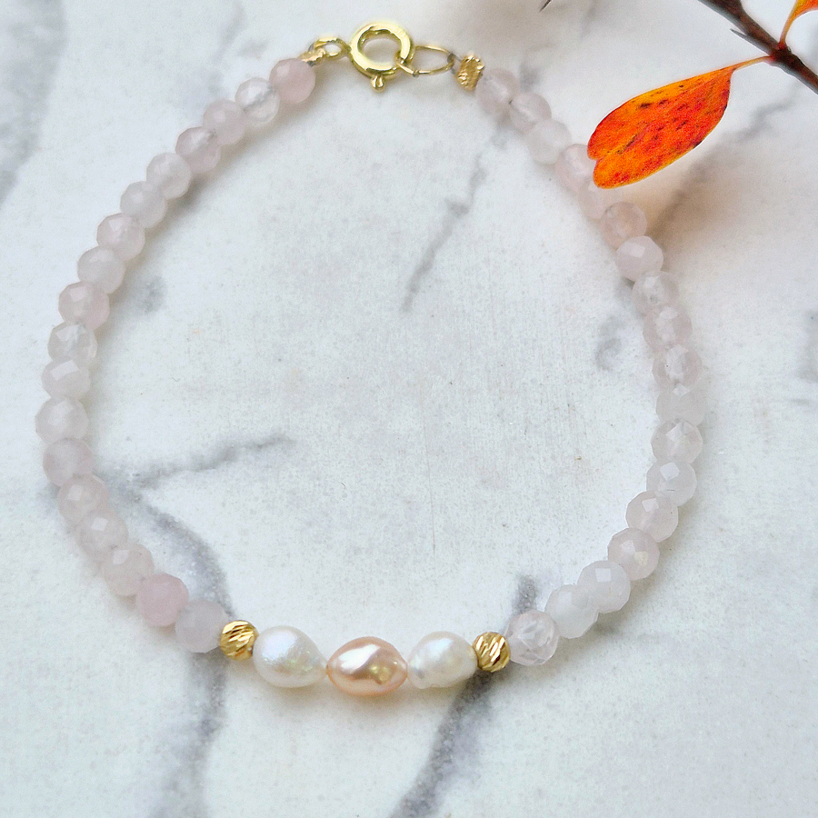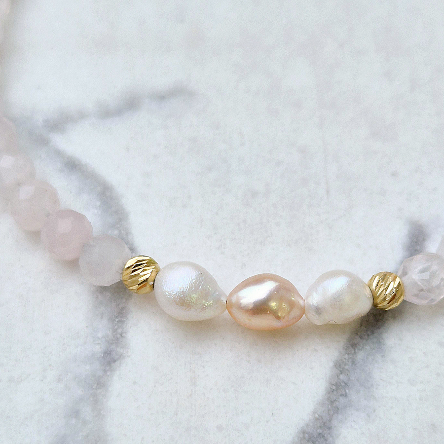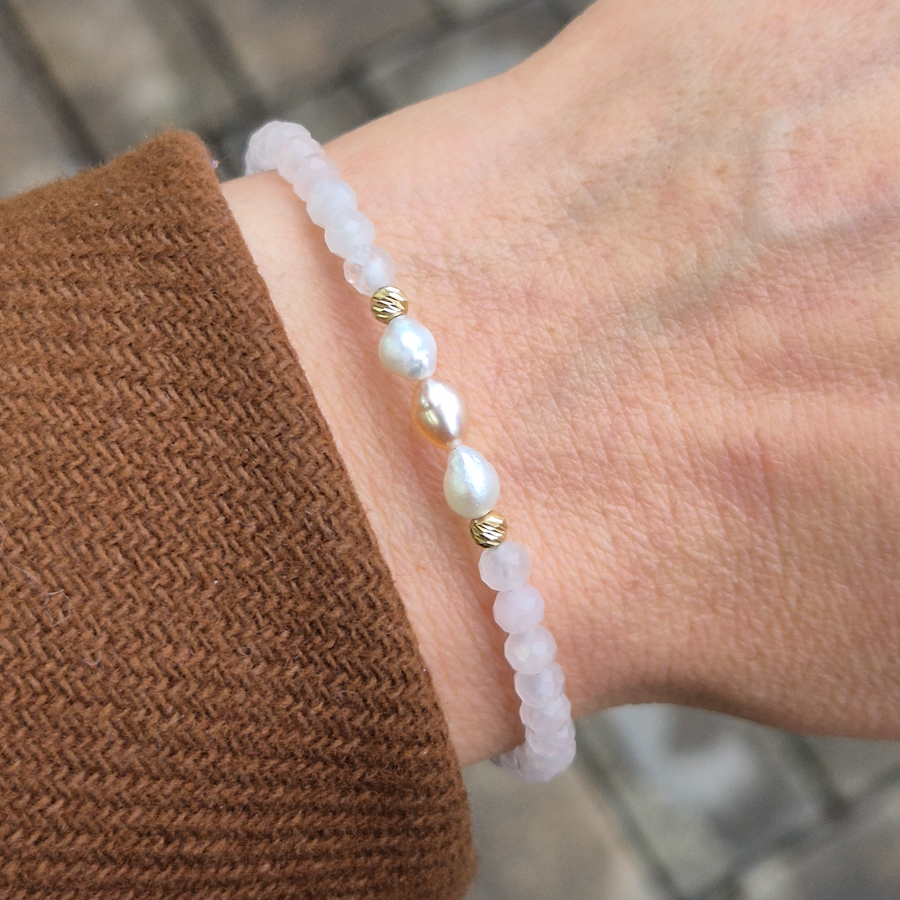 Tento jemný minerálny náramok je vyrobený z brúseného ružového mesačného kameňa a doplnený prírodnými riečnymi perlami nepravidelného tvaru, ktoré mu dodávajú elegantný a romantický vzhľad. Kombinácia pastelových tónov a zlatých detailov vytvára nadčasový, ženský štýl vhodný na každodenné nosenie aj výnimočné príležitosti. Je to perfektný darček pre ženu či priateľku, ktorá miluje originálne a jemné prírodné šperky.