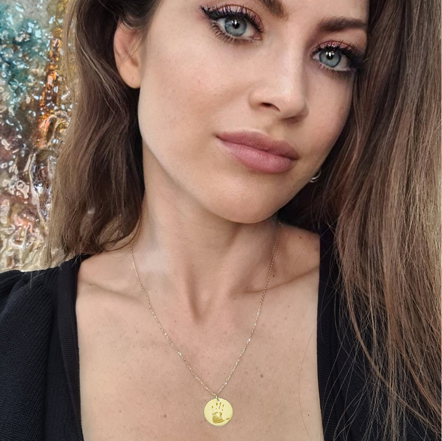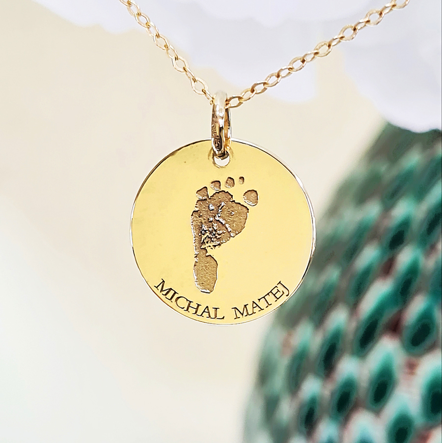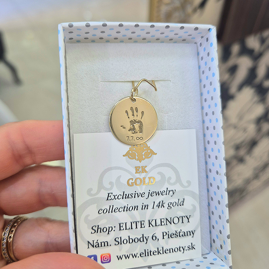Prívesok v tvare kruhu z 14k zlata s autentickým otlačkom je veľmi osobný a originálny šperk, ktorý spája symbol večnosti kruhu s jedinečnosťou otlačku vášho dieťatka, životnej lásky alebo rodičov. Tento personalizovaný zlatý šperk umožňuje uchovať vzácne momenty navždy.