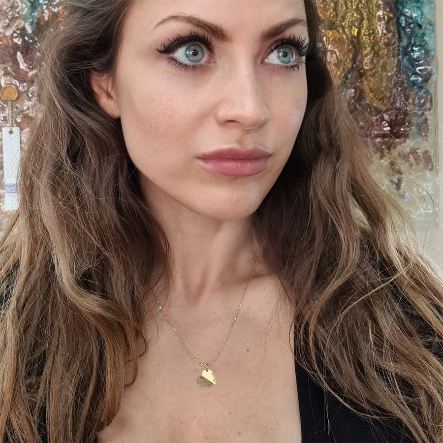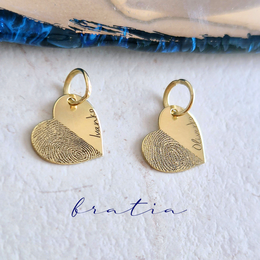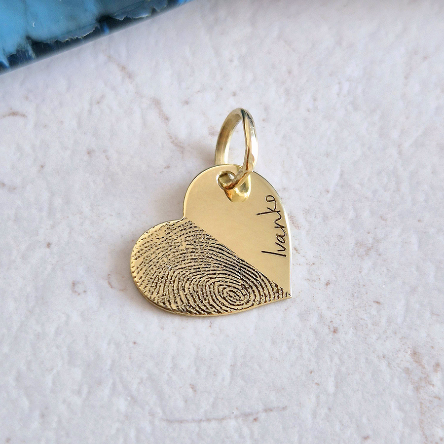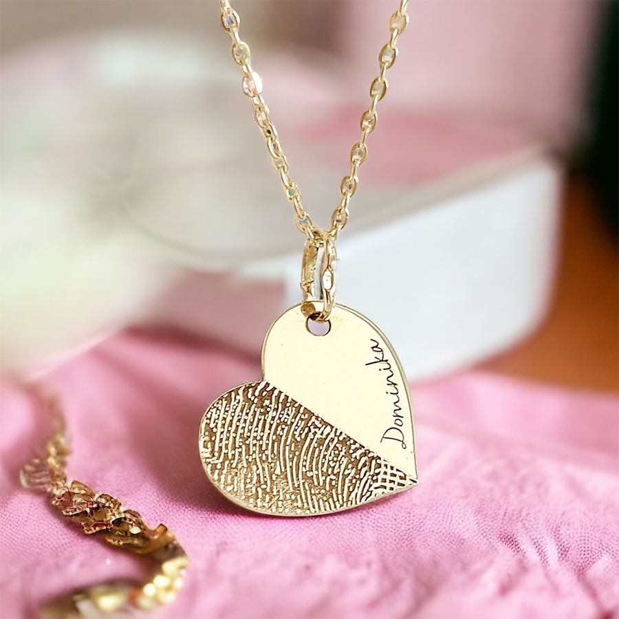 Jemný zlatý prívesok v tvare srdca s odtlačkom prsta je jedinečný symbol lásky a spomienky. Každý odtlačok je neopakovateľný – tak ako osoba, ktorú nosíte pri srdci.