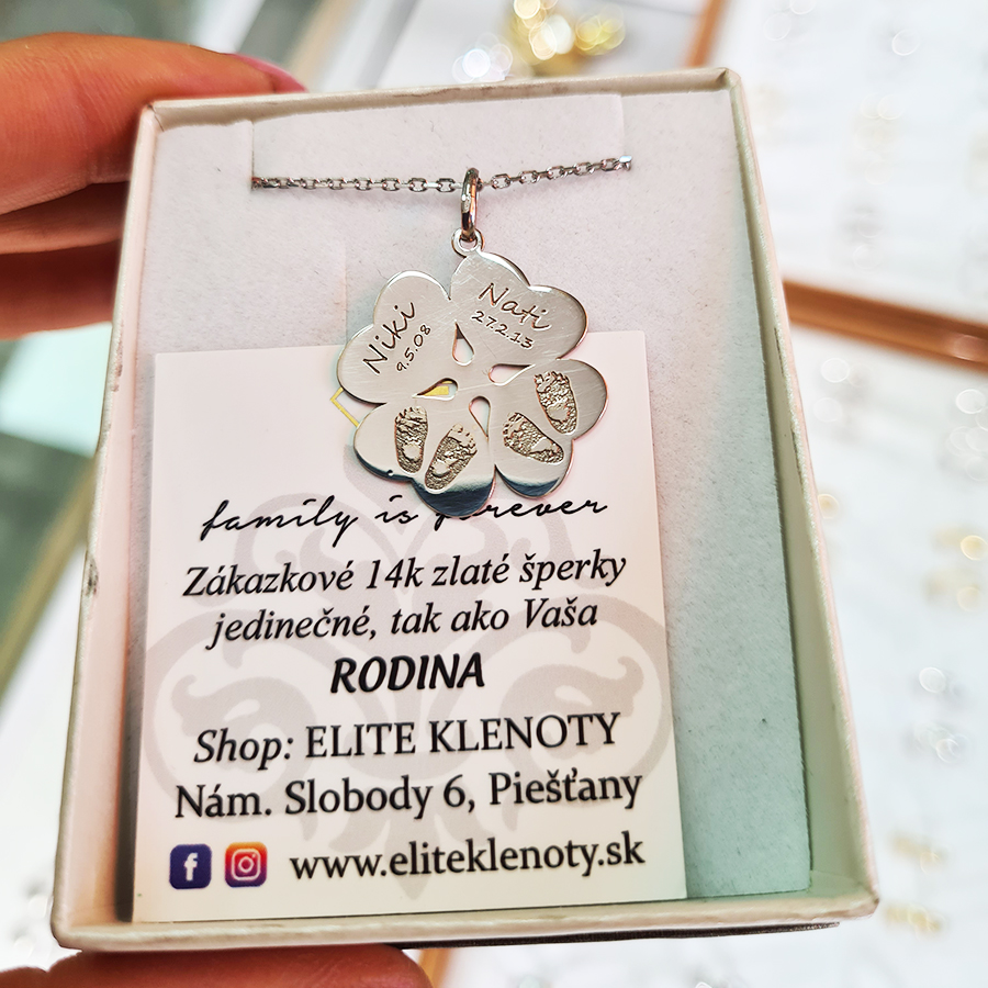 Náhrdelník v tvare štvorlístka v 14k zlate je šperkom pre štastie. Všetci túžime nájsť a hľadáme v živote to svoje štastie, pre každého iné a predsa pre všetkých rovnaké, pretože jedným z najväčších štastí v živote je mať pri sebe svoju rodinu ♥ ich otlačky, ktoré budete mať pri srdci sú ako balzam na dušu. Tento prívesok je ideálnym darčekom z lásky pre milujúcu mamičku, nerozlučné kamarátky alebo hrdú babičku.