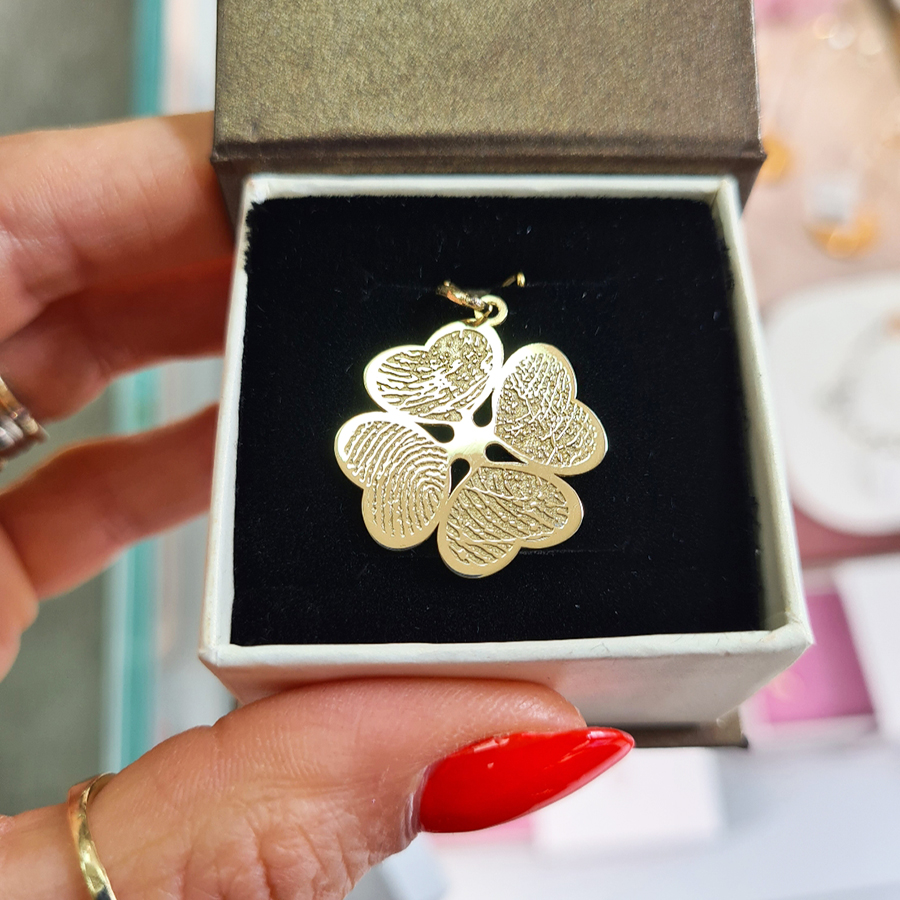 Na štvorlístok si môžete vygravírovať jeden až štyri otlačky, do lístkov možete teda dať jeden otlačok, meno, dátum narodenia a povedzme pôrodnú váhu alebo iniciály a otlačky detičiek či vnúčat.
