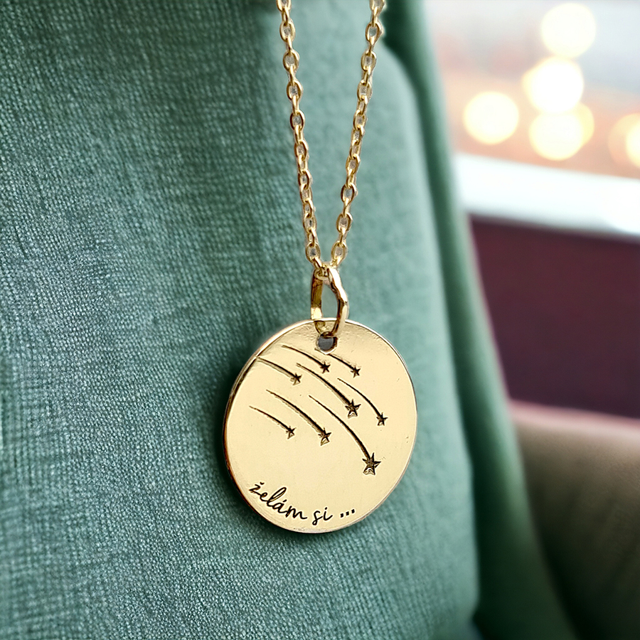 Zlatý prívesok s padajúcimi hviezničkami  a nápisom želám si.... je emotívny medailón a krásny odkaz.