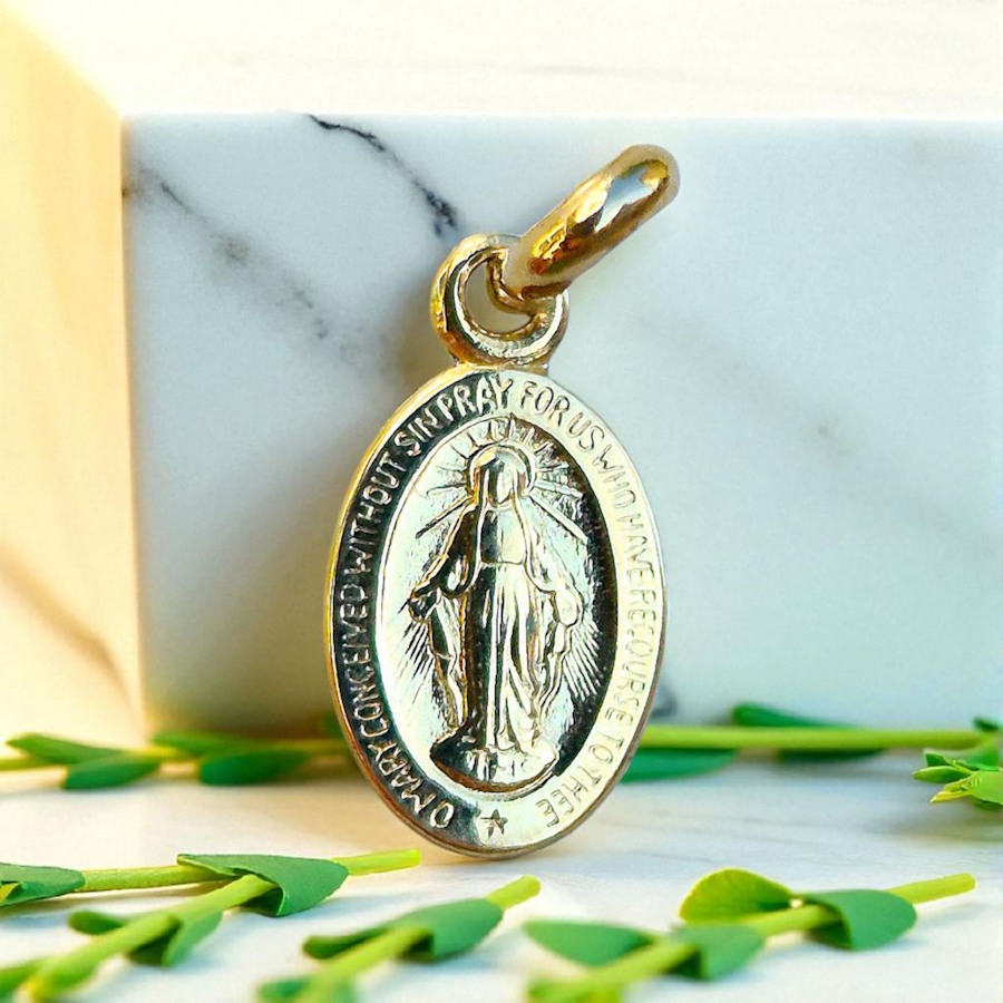 Zlatý malý oválny prívesok zobrazuje p. Máriu, tzv. Nepoškvrnené počatie, iní ju poznajú pod menom Zázračná medaila. Je to známy katolícky symbol, ktorý ľudia nosia na ochranu i ako symbol viery. Predná strana zobrazuje Máriu na zemeguli a pod jej nohami je had - symbol víťazstva nad zlom. Zadná strana: písmenno M a † a okolo je 12 hviezd, symbol apoštolov. Prívesok má dostatočne veľké uško, teda sa dá nosiť buď na retiazke, alebo na náramku.